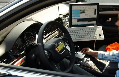 最近谍照记者设法拍到了奥迪新一代A8的内装照片。虽然这辆测试车的内装混合了现行版和下一代车型的内装配置,但仍能看出新车采用了新的方向盘,经过升级的仪表群以及造型古怪的变速杆,它或许可以提供包括自动泊车等先进功能。测试人员右侧放置的电脑显示了新车正在测试的是车辆监测技术,该技术利用摄像头和传感器来探测车辆是否处于可能与其他车辆发生碰撞的危险环境中。