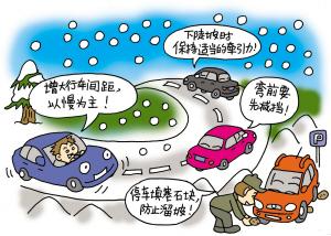 对于雪地的驾驶技巧,交警部门提醒车主,关键是以“慢”为主,并与前车保持足够的刹车距离。然而,路况的复杂,让很多驾驶员在发生侧滑时感到紧张。“如果车辆打滑,方向盘要顺着打滑方向轻轻地转,待车轮回正后,再轻轻地踩刹车。”“关键是要慢,平稳地减速及轻踩刹车,绝对不要在冰雪湿滑的路面上猛起步,或紧急刹车。”杭城资深出租车司机师傅们纷纷提供雨雪天气驾驶窍门。