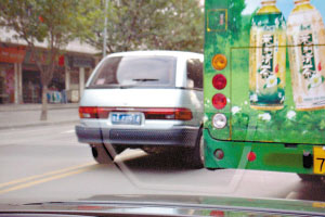 按照交通规则,马路上的双黄实线,车辆行驶既不能压线,更不能跨越。在天河岑村附近的这条长兴路,双向四车道却频频有车辆视中央的双黄实线为无物。图中左边这辆广州车牌的MPV,仅仅因为嫌前方的公交车行驶太慢,于是心急地从左方压着双黄实线超越前方的公交车。记者在现场看见,这辆车在超越中途,半个车身甚至越到了对面车道,影响相向车辆的行驶,相当危险。(邓莉)