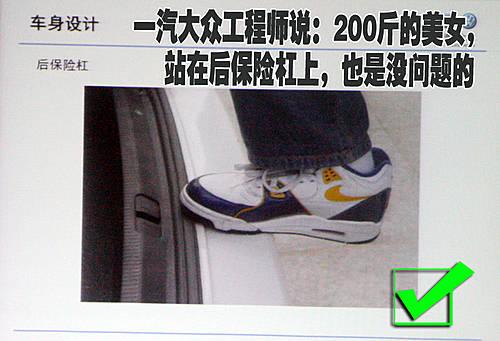 一汽大众产品部工程师这样说:“即便一个200斤美女站在我们产品的的后保险杠上,那也是没有问题的”。虽然我们身边很少有人去尝试站在保险杠上,但是这样的设计都源自大众的严谨态度,在很多时候您的爱车完全可以当作一架小梯子去使用。