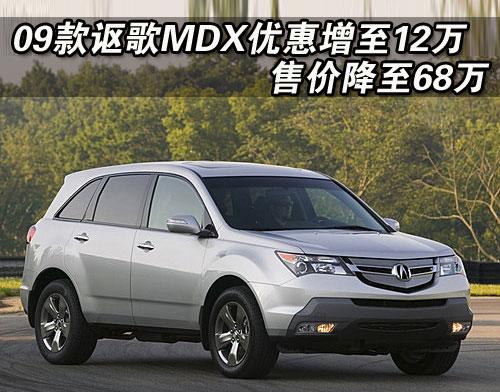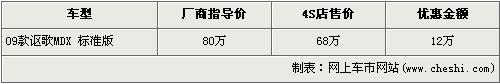 据经销商销售人员介绍,09款讴歌-MDX的现金优惠12万元,优惠后售价也从原厂商售价80万降到了68万,首次跌破了70万元。销售人员还介绍,09款讴歌MDX增加的实用性的配件包括前下护板和后下护板,能避免恶劣路况对底盘带来的损伤,并且09款讴歌MDX还新增了巴厘海蓝和摩卡褐金两种颜色,店内现车非常充足,颜色也比较全,欲购买者挑选的空间非常大。