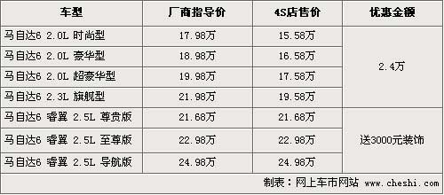 据4S店销售人员介绍,目前马自达6销售的车型除了新款睿翼外,还有老款车型有现车供应,消费者到店购车可得到2.4万元的现金优惠,车价最低仅为15.58万元。新款马自达6睿翼虽然没有现金方面优惠,但购车可以赠送3000元左右的装饰,消费者可以根据需求选购。