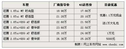 据4S店销售人员介绍:目前迈腾最高优惠1.1万元,再送1万元装饰套餐,其中包括9项升级,总计优惠可达2.1万元。目前迈腾现车充足,销量最大的黑色车现车较多,并且迈腾全系均可享受1万元“大礼包”活动,但2.0Tsi车型优惠幅度较小,建议购买1.8Tsi车型。