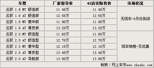 据北京地区现代4S店销售人员表示,现在各4S店内均有MOINCA名驭2.0L现车销售,由于是刚刚上市的新车,所以在价格方面没有任何优惠。至于1.8L车型,销售人员则表示,1.8L车型要到9月份才能到店,目前接受现金预定。销售人员还表示,1.8L的MOINCA名驭将主要面对出租车市场,所以客户需要等待较长一段时间。