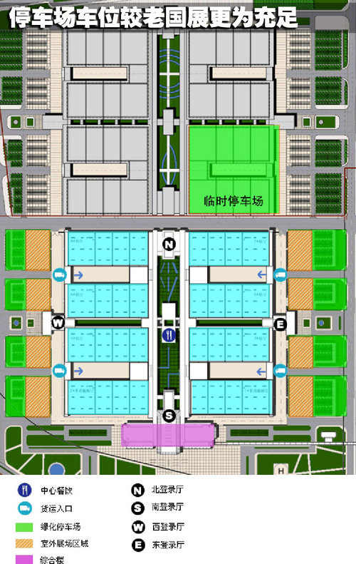 中国国际展览中心(新馆)一期工程总停车位达到了3684个,绿色区为停车区,橙色区为室外展场区域,不占用时也可作为停车场。较老国展停车位更为充裕,并且原先消费者在老国展无车位路边停车时都有过被警察贴条的事情发生,而新国展地处开发区,停车自然会方便许多。