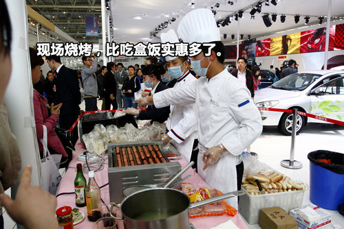 一般车展时厂商都会发一些小礼品,这已经可以让自己的展台人满为患了,不过本次北京车展上,有的厂商当场开起了烧烤,烤肠以及饮料似乎更吸引人,并且场馆里用餐真的不便宜,所以来这里简单吃点,填饱肚子也不失为一个好办法,经济实惠。