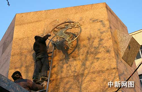 下午四时三十分许,记者在石家庄市和平西路三鹿集团总部看到,两名工人开始拆除门口警卫室旁东西方两侧的“三鹿”标志。总部门口“石家庄三鹿集团股份有限公司”的字样已经被拆除,只留下模糊的痕迹依稀可辨。