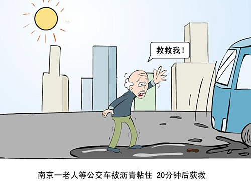 新闻浮世绘:南京一老人等公交车被沥青粘住