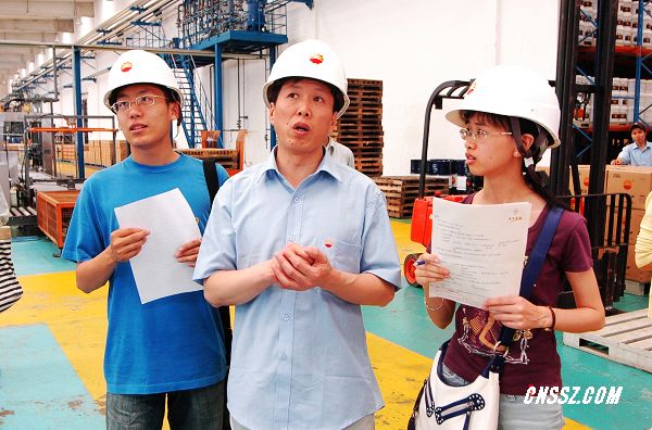 图为:网络媒体记者听取关于华东润滑油厂介绍。 摄影:姜振华