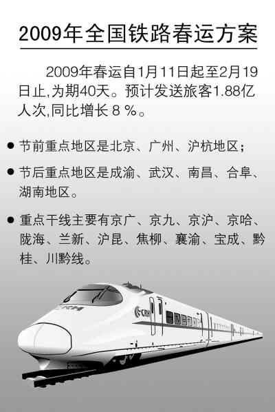 铁道部8日宣布,2009年全国铁路春运自1月11日起至2月19日止,为期40天,其中春节前15天,节后25天。