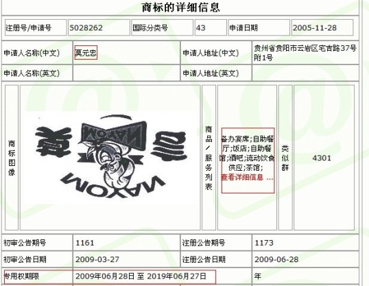于是,莫元忠于2005年11月28日注册了“莫言”餐厅类商标,挂起了“莫言饺子馆”的牌子。记者在中国商标网查到,2009年3月27日,“莫言”餐厅类商标初审公示,同年6月28日正式注册成功,专用权期限一直到2019年6月28日。