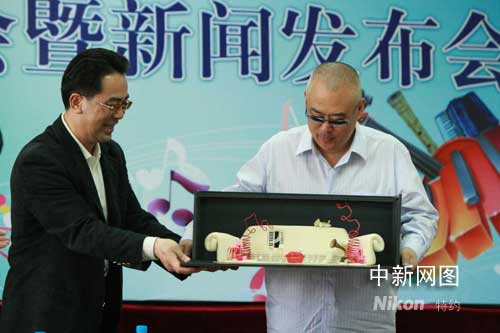 中国儿艺院长周予援向郑渊洁(右)赠送《红沙发音乐城》的舞台设计模型。