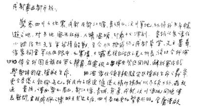 5月20日一大早,本报的传真机就吐出了一封还带着热度的手书繁体字慰问信,信的末尾写着“金庸谨启”四个醒目的字。金庸先生身边的工作人员告诉记者,虽然金庸先生有多位秘书,但是他还是坚持自己手写并亲自传真慰问信。在信中金庸充满深情地写道——