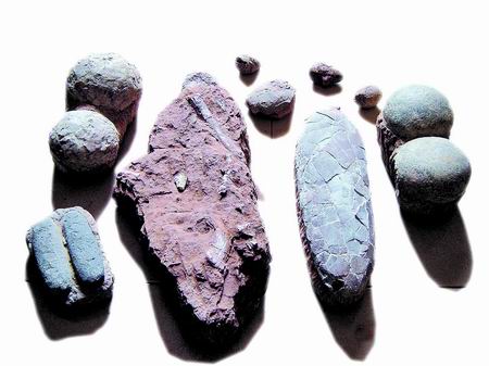 “这是村民们开山修筑赵营村至金花村‘村村通’公路时发现的。”张丰臣说,“目前,仅新修公路沿线两公里范围内就发现有二十多窝这样的恐龙蛋化石,估计实际蕴藏量不下100窝。同时还发现了树枝蛋、戈壁棱柱形蛋等十多种恐龙蛋化石。”在村部,张丰臣向记者展示了临时保存的修路施工中拾到的蛋化石和龙骨化石。