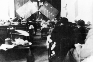 苏河清说:拍摄会场是很困难的。那时不像现在一个人扛着现代化的机子,一拍就能完事。当时为了拍摄会场下面的场景,我们费尽心思,最后想出一个办法来,在开会以前,我们从会场后门进去,藏在幕布后面,把三角架稳固好后,又把幕布拉了个口子,把机头刚好从口子那儿探出去,来回摇着拍。当时屋里光线太暗,胶片感光太慢,借用西窗射过来的太阳光进行拍摄。所以资料片忽明忽暗,不太清晰。