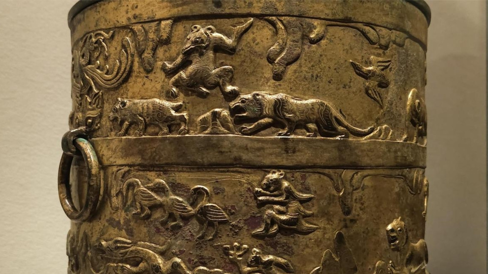 在山西博物院的“民族熔炉”展厅内,一对光彩夺目的鎏金铜樽引人注目。是什么原因使得中原元素与草原风情同时出现在这件铜樽上?