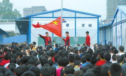 5月6日,芦山中学的同学们在已经建成的板房教室边举行升旗仪式。