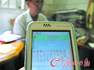 本报讯 (记者曾毅摄影报道) 今年74岁,曾任顺德区人大代表的黄其厂老人,昨天终于等来了一条期盼多日的短信,“谢谢黄叔对我的鼓励,我以后会改正我不足之处,以后多和父母沟通。”
