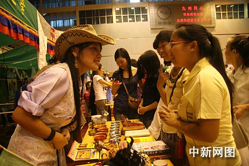 在藏族展台边,记者看到,身着藏族服装的两位藏族男生将藏饰、藏族食品以及青稞酒摆了满满一桌。两位藏族学生一边向大家介绍从家乡特别带回的奶酪、炒青稞以及藏豆等食物,一边忙着以内地少见的酥油茶招呼同学。有瓜果之乡的新疆维吾尔族展台更是琳琅满目。身着鲜艳的维族服装的少女亦忙着向汉族同学介绍美丽的家乡。
