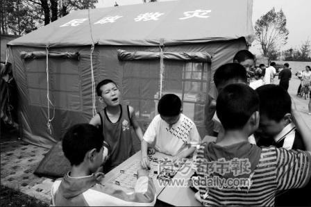 19日10时30分:谷胜聪坐在初一教学部的电脑前,15平方米大的帐篷里坐着近10名老师。检查过记者的证件后,谷胜聪拿出一包润喉糖,拿出一颗后又塞进包里。