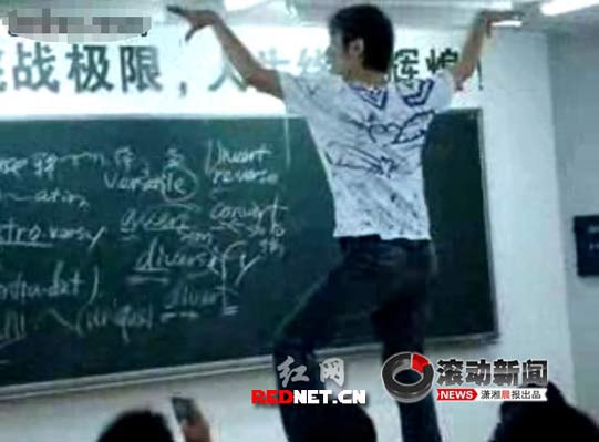 还有一段视频显示,周思成打扮时尚,上身穿格子上衣,下身穿着裤腿上有一窟窿的牛仔裤,发型也很时尚,黑板上有一些粉笔英语,应该是在某节课即将结束的时候,开跳前他往往自我调侃下,“请各位同学不要觉得恶心”,随后在播放英语音带的机器上播放舞蹈音乐,然后戴上假面舞会的面具,随着音乐及女学生的尖叫热舞起来,同样有不少女大学生举起手机拍照拍视频,跳完后又走进同学中间进行交流。