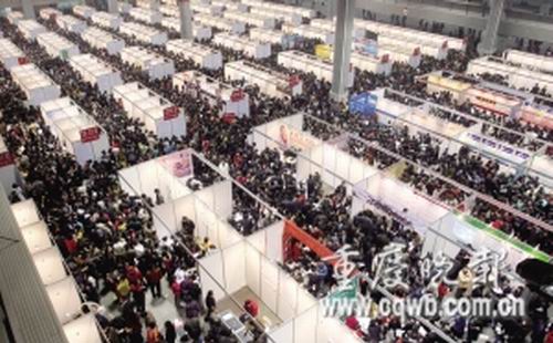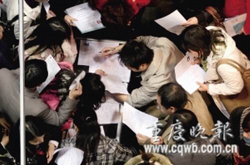 沙坪坝区人才市场举行房地产开发类专场招聘,结果进场的大型知名地产开发企业为零,一个售楼员职位,上百人抢。