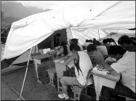 昨天下午,茂县中学操场上架起了8个巨大的白色帐篷,帐篷上印有联合国儿童基金会的蓝色标志。每顶帐篷里都坐满了高三学生。为了散热,帐篷两侧都被撩起来通风。4点刚过,喧闹的帐篷内顿时安静下来,其中一个帐篷里不久后传出了一片读书声。旁边的“教室”内学生们安静地做着卷子。记者悄声问坐在帐篷边的一位女生上什么课,她悄声回答:“地理。”