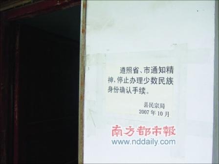 在民宗局办公室的门口处,张贴着落款为“2007年10月”的一份告示,“遵照省、市通知精神,停止办理少数民族身份确认手续。”彭柳说,这是因为找她们办民族变更手续的人很多,“很烦,就在门口贴了这张公告。”