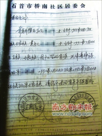 7月18日下午,石首市绣林办事处槐树堤居委会办公室张会计回忆,2006年7月25日,一名妇女曾找到她,请居委会开具一份证明,这名妇女还找来了一位熟人,以证明她的身份。由于有熟人介绍,她便盖了公章。