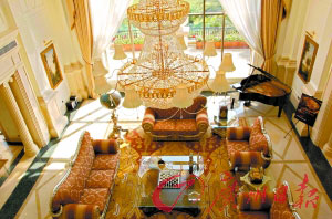 据介绍,仅仅一些大宅橱窗柜内、茶几上、西餐厅里一些餐具饰品的摆放总价值便达50余万元。在主厅内,巨型水晶吊灯正下方摆放的长形餐桌上,一对看似普通的玻璃杯便价值近2000元,一个小小的麦片碗也需929元。而价值2万余元的300年干邑搁置在茶几上。连在客厅外侧长廊上随意摆放的“夏威夷之梦”雕塑也出自名家之手,全球限量29件,价值近12万6千元。