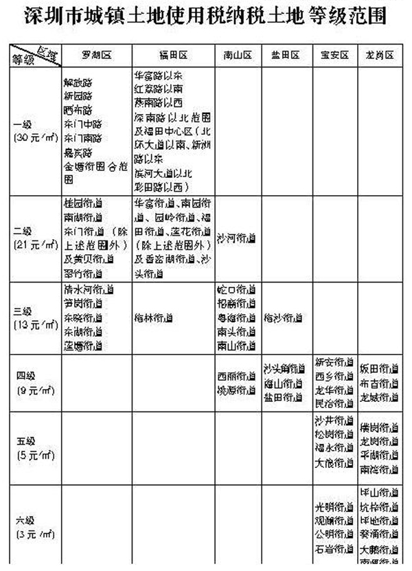 记者了解到,罗湖和福田区适用的税额最高,均为三级以上土地。其中罗湖区的东门中路、解放路,福田中心区等地域都属一级土地,每平方米年税额达30元,而罗湖区的莲塘街道和福田区的梅林街道等地域属于三级用地。另一方面,宝安和龙岗区适用税额最低,均为四级以下土地;南山区和盐田区则适用二到四级土地税额。