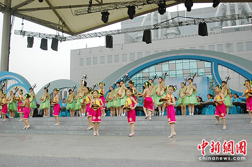 中新网上海6月27日电(赵龙)行云流水的古筝、欢快奔放的二胡、委婉铿锵的琵琶……今日伴着淅淅沥沥的雨声,百余名苏州少年带来的“琴瑟沧浪”民乐演奏音乐会,在世博园全球城市广场奏响,让中外观众领略了一把中国传统民乐的魅力。