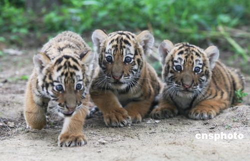7月23日,济南跑马岭野生动物世界3只东北虎幼崽与游客见面。据介绍,这3只虎宝宝是6月16日降生的,是4岁虎妈妈“苗苗”和4岁虎爸爸“亮亮”的爱情结晶。目前,小虎崽发育良好,健康活泼。中新社发 吕传泉 摄