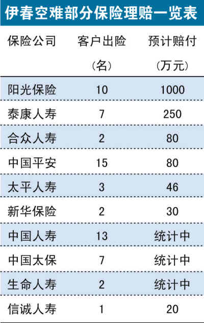 泰康人寿则表示,已确认有7名客户出险,其中有5名客户不幸罹难,为团险和创新网销客户,每人保额50万元,累计预计赔付金额250万元。截至目前,阳光保险累积预计赔付可能是最多的公司,有10名客户遇难,预计赔付超过1000万元。