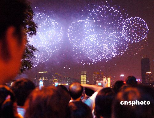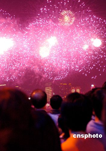 10月1日夜,数十万香港市民和游人聚集香港维多利亚港两岸,观看庆祝中华人民共和国成立五十七周年烟花汇演。斑斓多彩的烟花汇演共有十幕,每一幕烟花皆各具特色,第十幕《心连心的中国人》是高潮,红、紫、黄、蓝、青、绿色的牡丹形烟花在空中盛放,加上二百多发的“钛雷礼炮”,祝愿祖国繁荣昌盛。中新社发 王丽南 摄