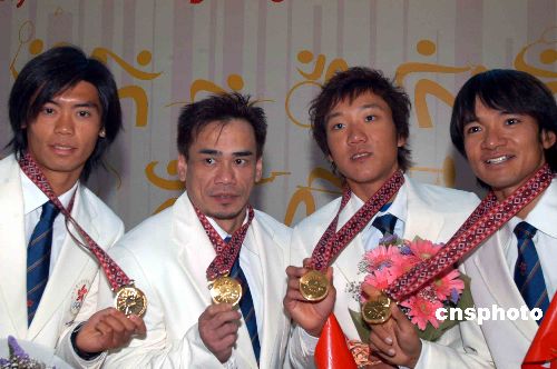 在多哈亚运夺取金牌的香港运动员陈敬然、陈润滔、张敬炜及黄金宝(左起),17日返抵本港,在欢迎仪式上展示金牌。中新社发 谭达明 摄