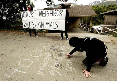 这9名抗议者,不顾天气的炎热,戴面具、裹头巾,聚集在一名加利福尼亚大学伯克利校区的毒物学教授家门口,其中一名抗议者用粉笔在地上涂写“杀手”的字样,另一名抗议者用扩音器高呼:“你的邻居杀害动物”。