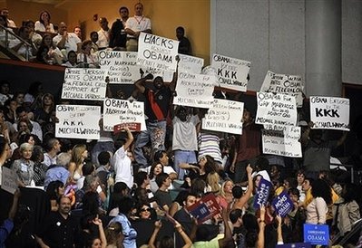 据“中央社”报道,希望成为史上首位非裔美国总统的奥巴马19日在迈阿密大学的篮球馆举行造势集会,正当他在台上发言时,观众席看台角落出现抗议群众,他们手持标语,上头写道:“三K党支持奥巴马。”