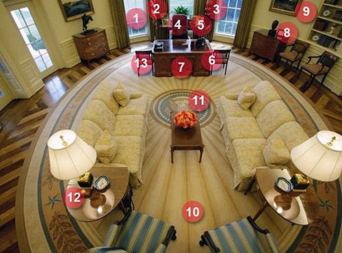 以下为奥巴马入主宫椭圆形办公室后,其内部陈设猜想(号码如图):