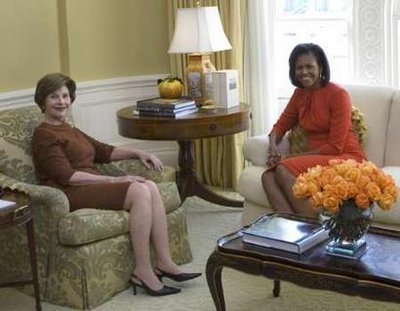 中新网11月11日电 据星岛环球网报道,美国准第一夫人米歇尔10日随同候任总统丈夫奥巴马到访白宫,趁着丈夫与总统布什进行会谈的时候,在白宫范围内到处逛逛看看,包括参观他们一家两个多月后便会入住的白宫行政大楼33个房间。为她充当向导的,是已经在白宫住了8年的现任第一夫人劳拉。