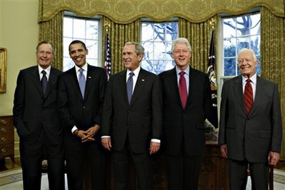 布什和奥巴马讲话后,五任总统站在美国总统椭圆办公室合影,资格最老的卡特和老布什一左一右站在两边,每个人都露出了绅士的笑容。