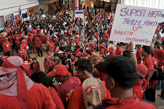 在会议中心外围,早上一直坚守在门口与四周的一队队军警已经不见踪影,原先设置的铁架障碍物与铁丝网也被挪开,举目所及,酒店的庭院里、树荫下、停车场都是人头攒动的“红衫军”,他们高举着要求阿披实总理辞职的招牌,呐喊不停。