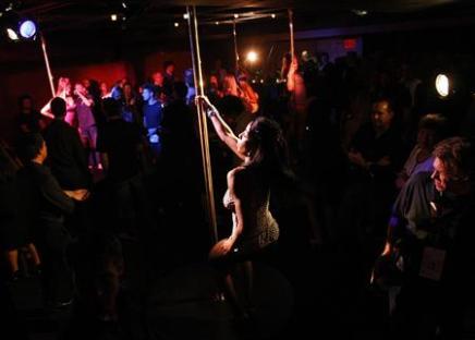 随后,时代广场附近的一家酒吧改造成一家绅士俱乐部,供模特们进行钢管舞表演。表演时,模特穿上最新款的内衣,一次4人,在钢管上下来回舞动,极尽挑逗。