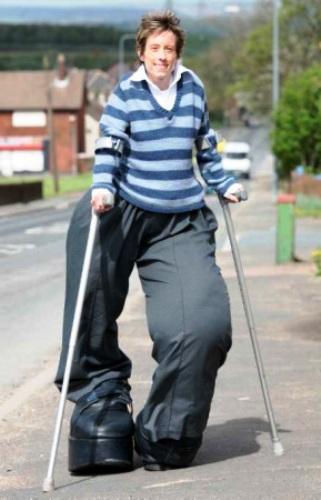 让她的家人惊讶的是,她在整个童年时期,两条腿的生长速度都一直比其它身体部位快!最后她再也不能独立行走了。现在她要借助拐杖,或者借助一辆经过特殊改装的汽车才能出行。塞拉斯的家在英格兰西北部,她一直找她们家附近的一位鞋匠定做鞋子,因为她的两只脚也畸形发育,右脚长16英寸(40.64 厘米),宽7英寸(17.78 厘米),但是她的左脚长仅有11英寸(27.94 厘米),而且整个脚是反长的。不仅如此,塞拉斯的两条腿长度也不一样。因此每定做一双鞋,她都要仔细试穿,反复试穿直到最后确定鞋样,整个过程需要花费几周时间。定做这样一双鞋的费用大约是4000美元,塞拉斯必须筹集这些钱,因为她没有工作。