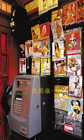 有关英国伦敦妓女的宣传贴纸满布电话亭。 (资料图片)