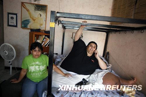 10月2日,在墨北部城市蒙特雷,体形肥胖的曼努埃尔·乌里韦(右)与女友格拉迪亚·索利斯在家中。乌里韦体重曾达到560公斤,被《吉尼斯世界纪录大全》列为世界最胖之人。经过两年多的减肥治疗,他目前体重已降至310公斤左右。乌里韦近日宣布,他将在本月26日迎娶相恋两年半的女友。新华社/路透