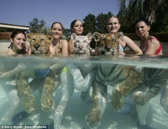 据英国《每日邮报》报道,在海边的游泳者要不时巡视海面以防大鲨鱼,不过,对于美国南卡罗莱纳州一家动物园的女训兽师们来说,与小老虎们一起游泳已是她们的例行工作。