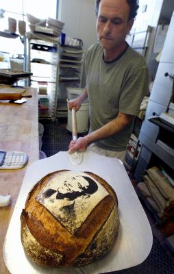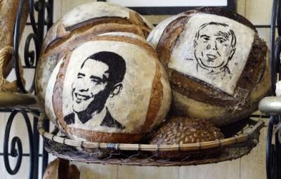 中新网10月31日电 综合报道,美国加州的一家面包店的老板别出心裁,在面包上印上美国民主党总统候选人奥巴马和共和党总统候选人麦凯恩的画像,并将这些面包出售给顾客。当顾客将面包买回家享受的时候,说不定就能“咬到”未来的美国总统,并把“他”吞进肚子里。