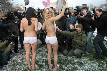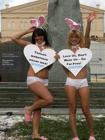 尽管莫斯科室外天气已经是冰雪寒天,但是善待动物组织成员打扮成兔女郎的形象,高举“爱我们,不要穿皮草”的标语,站在寒冷的莫斯科市区,摆出各种姿势让记者拍摄和接受采访。