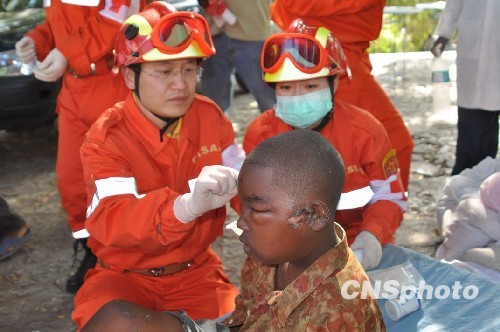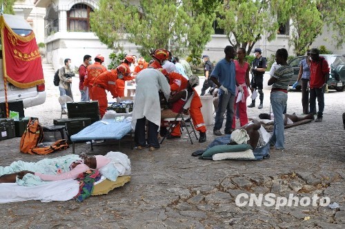 海地当地时间14日9时,中国武警总医院赴海地国际救援医疗分队开设第一个流动医疗点,已为110名受伤的灾民提供医疗救助。海地总理礼宾官赶到医疗救助点,他握着来自中国武警总医院的医生的手说:“感谢中国国际救援队,你们是第一支来总理府进行人道主义救助的救援队”。